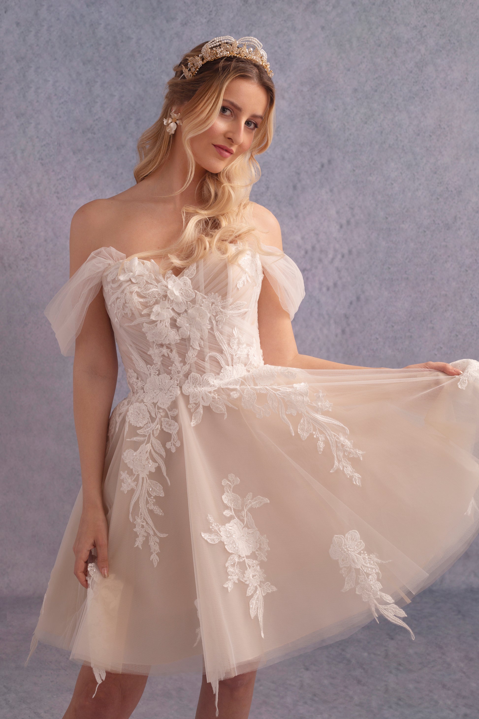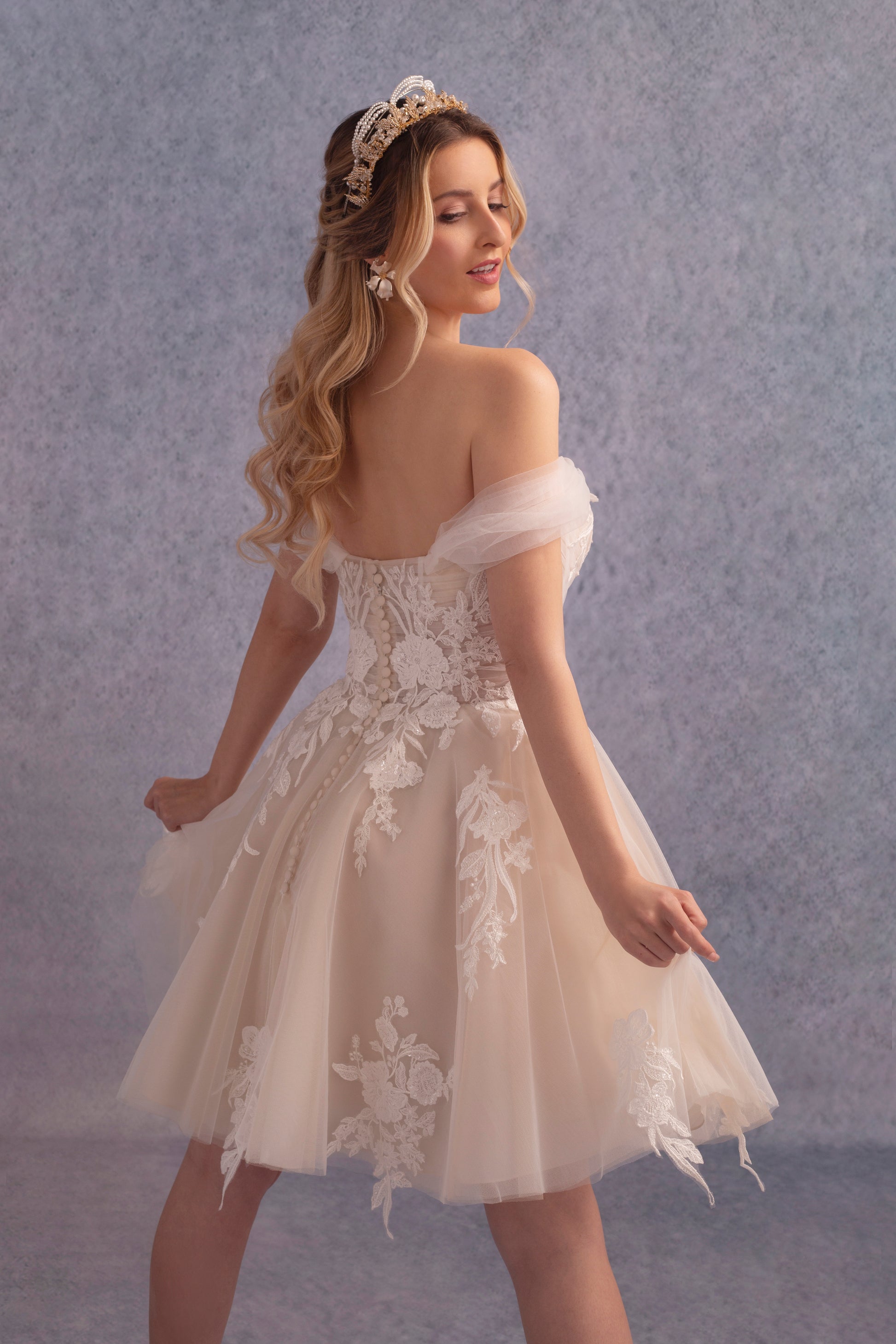 Amphora offers timeless elegance with a twist. A sweetheart bodice, draped and adorned with lace appliqués, meets a voluminous A-line skirt scattered with matching lace. When the detachable skirt is removed, a playful short dress is revealed—effortlessly transitioning from day to night. Fastened with covered buttons and stretch loops.