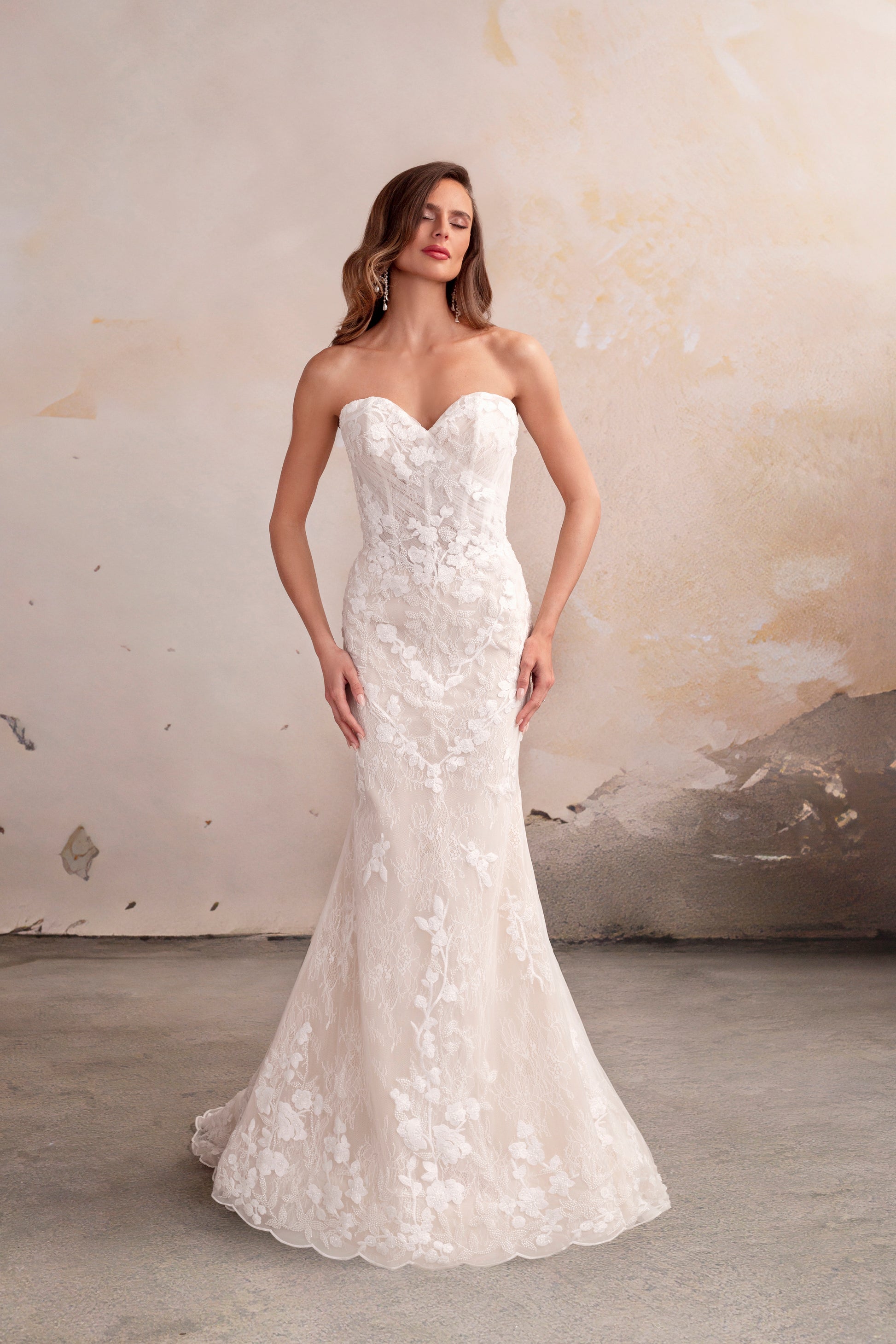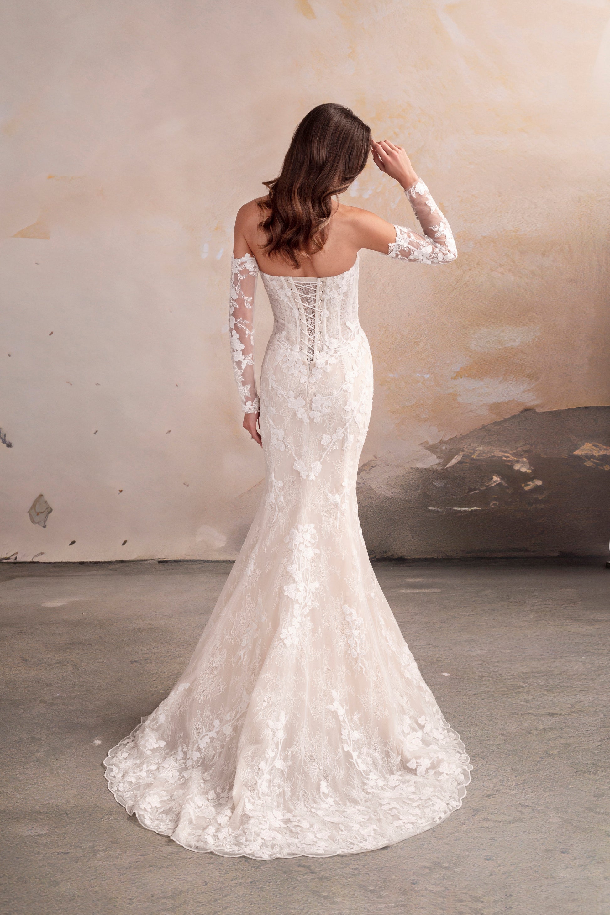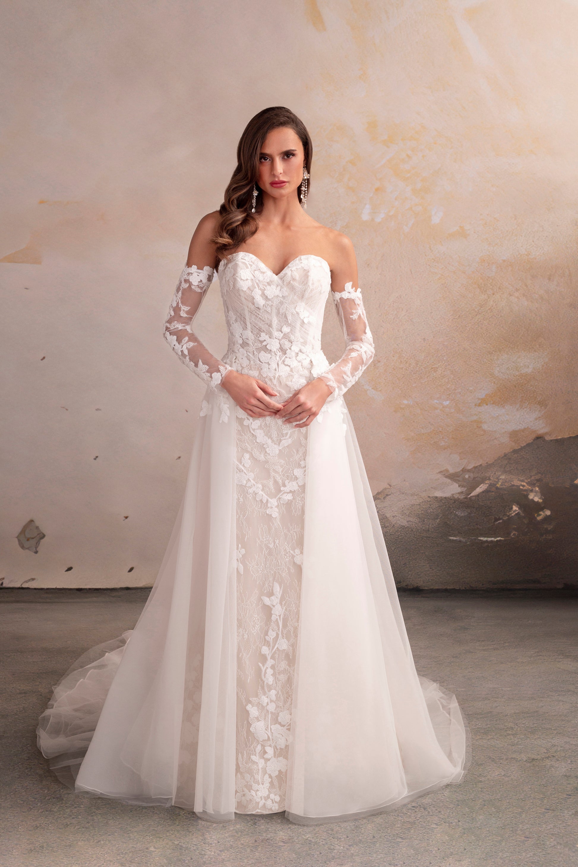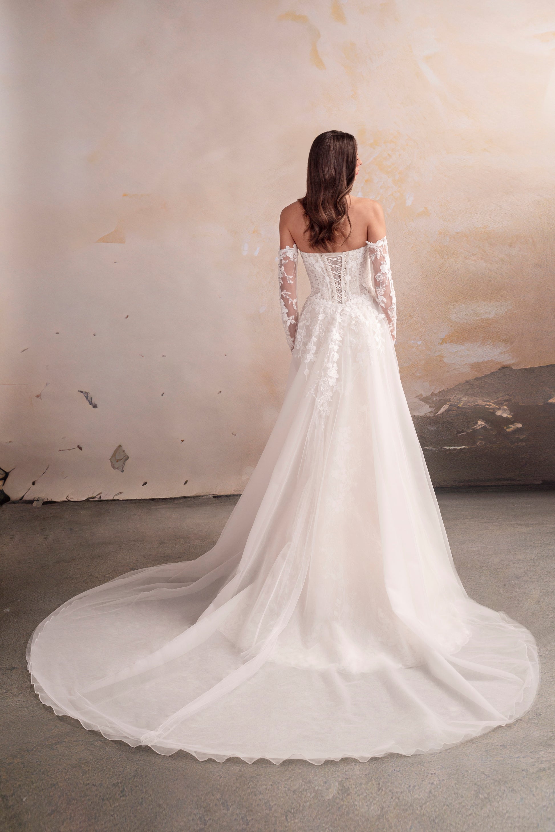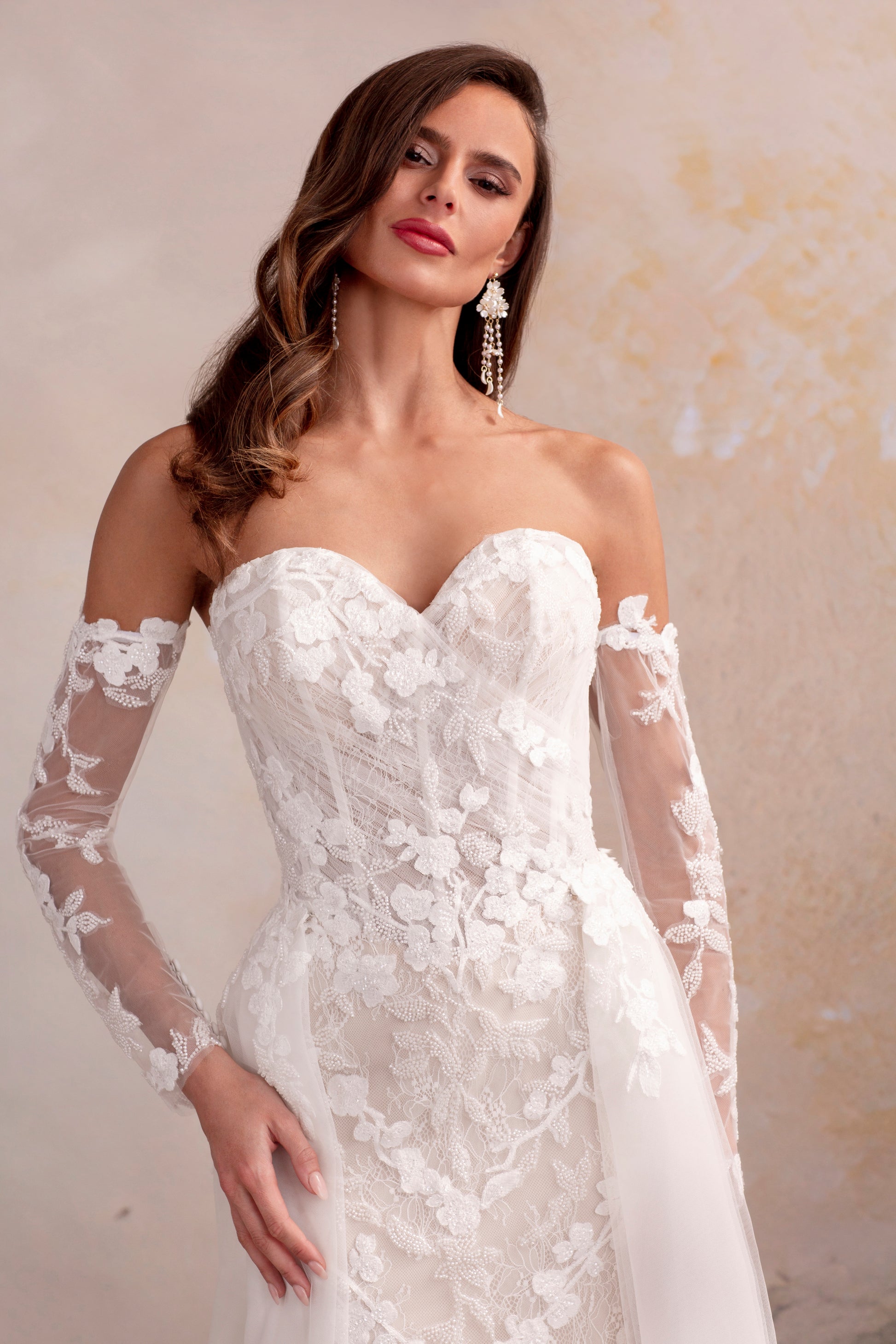 Cecilia blends vintage romance with modern versatility. A fit-and-flare silhouette is sculpted in beaded lace, while the semi-transparent bodice adds subtle drama. The detachable tulle overskirt and optional lace sleeves allow for multiple styling options—perfect for transitioning from ceremony to evening celebration. Featuring a cathedral train and corseted back, this gown is also available with a button-up finish.