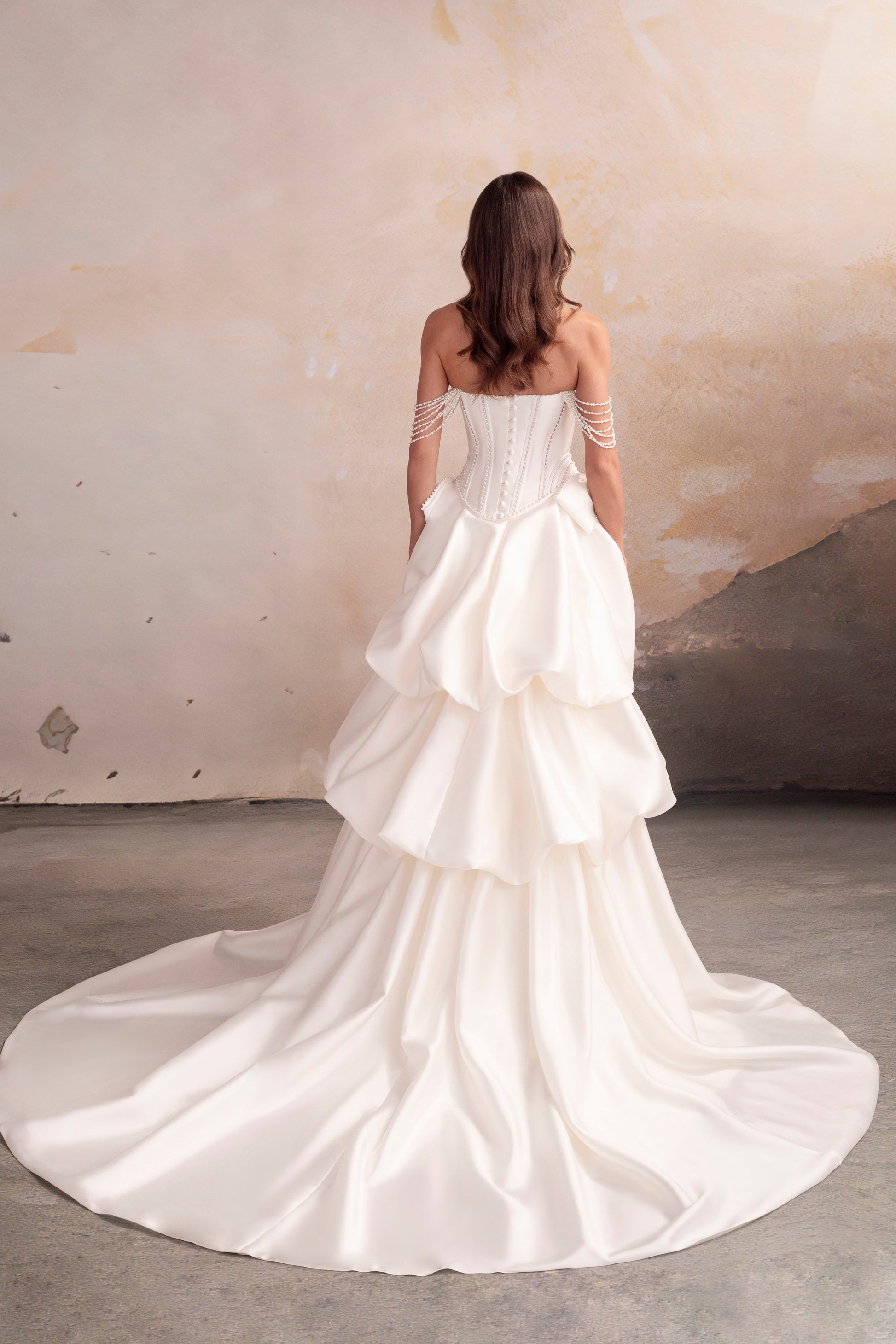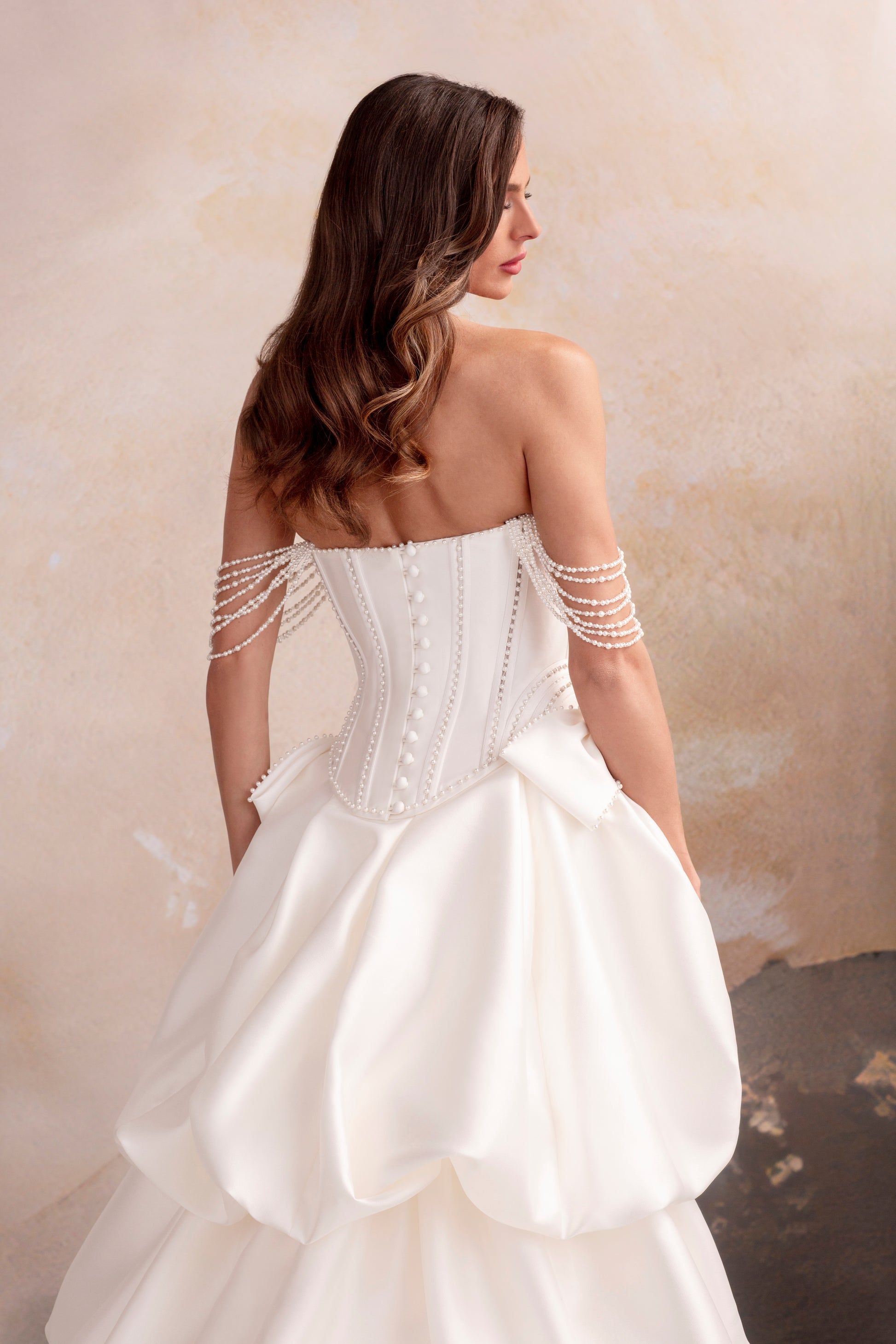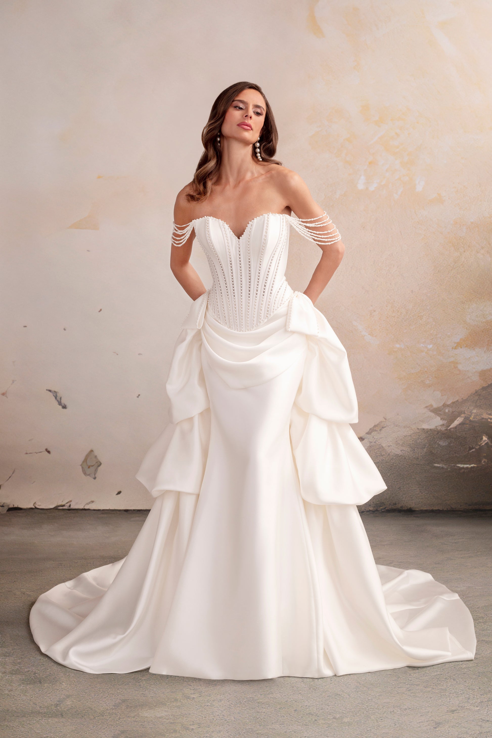 Designed for impact, Emerson is a three-piece gown that adapts to your moment. A pearl-embellished corseted bodice sits atop a fit-and-flare skirt, layered beneath a detachable bustle overskirt and chapel-length train. With optional hip bows and pearl-draped sleeves, this look is a love letter to drama and flexibility. Ask about button or lace-up back finishes to suit your style.